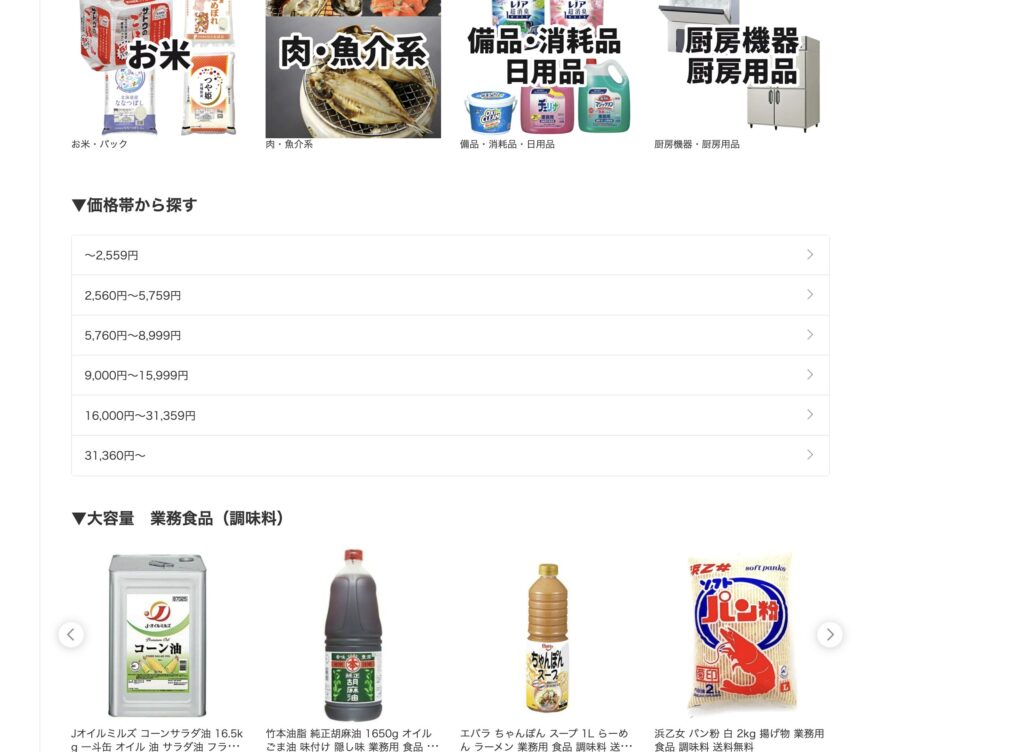 トップページに来たお客様が様々な検索方法で商品を探せるよう、大バナー・小バナーだけでなく価格帯や業務用・一般用などのカテゴリも追加。